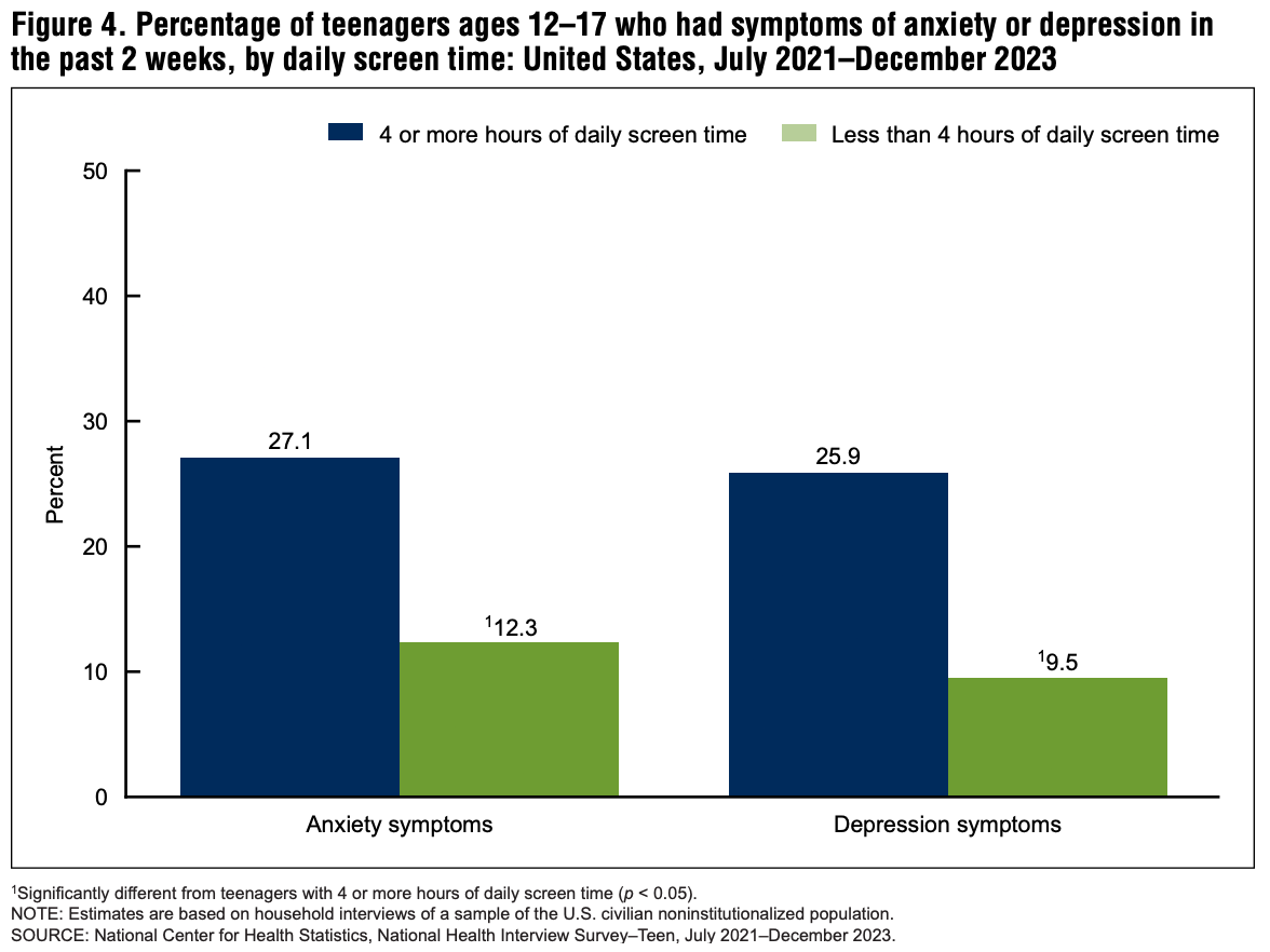 According to the CDC, teens who report higher levels of daily screen time also report more symptoms of anxiety and depression: