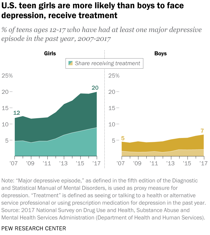 According to research from Pew, self-reported depression symptoms began accelerating around 2012, especially among girls: