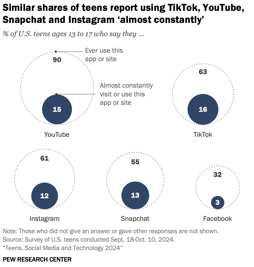 According to a Pew survey, approximately 15% of teens report using YouTube, TikTok, Instagram, and Snapchat “almost constantly”:
