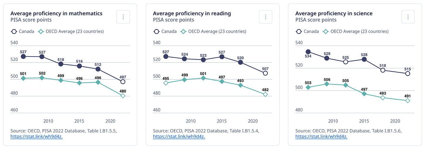 The PISA test is a measure of 15-year-old students’ skills in reading, math, and science. It’s administered by the OECD in each of its member nations every three years. Since ~2012, scores have declined in each category across member nations. Below is a depiction of Canada’s performance compared to the OECD average (which includes the U.S.):