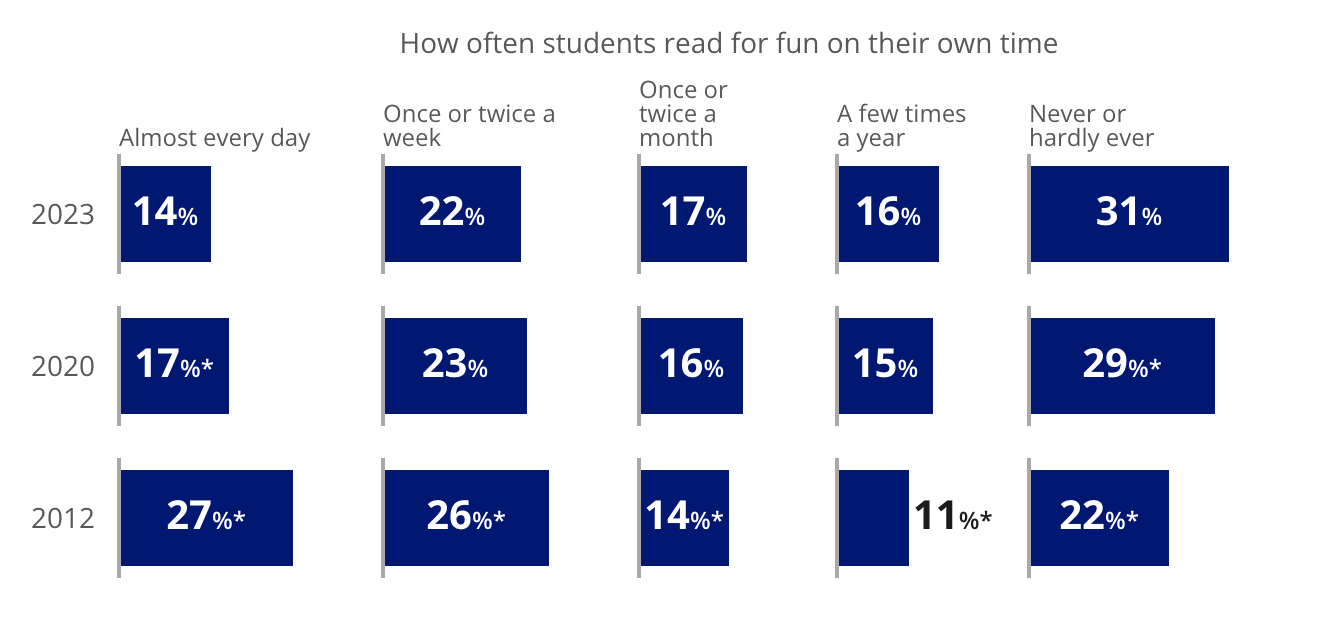 Across the same time horizon, reading for pleasure has been in steep decline, according to the American NAEP assessment survey: